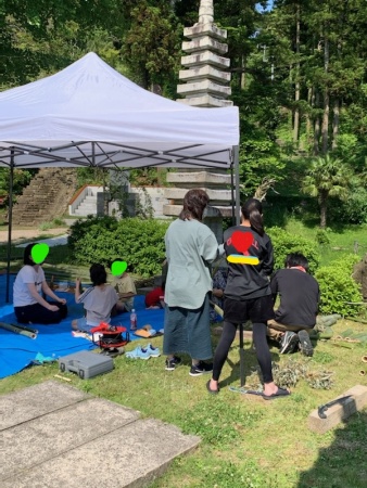 本堂の外で「花入れ」「湯飲み」「カード立て」「コマ」…作りました。