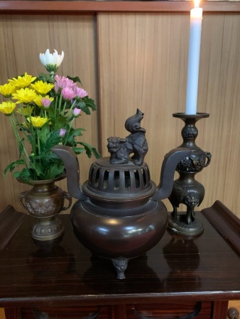 お仏壇や神前での荘厳(飾り)の前に必ずある、香炉(お線香立て)やロウソク立て、、、鼎(かなえ)。